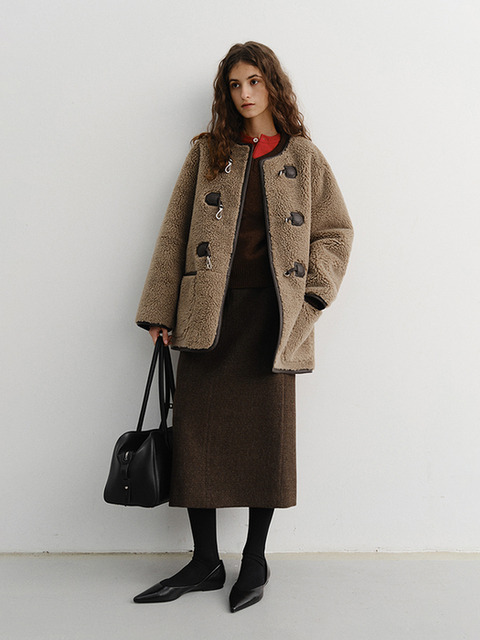 [던스트] COLLARLESS BUCKLED SHEARLING JACKET MOCHA BEIGE_UDJU5D223K1