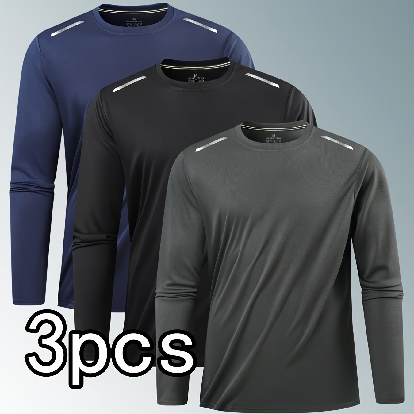 TEMU 남성용 캐주얼 스포츠 티셔츠 3종 세트. 라운드넥, 단색, 속건성 긴소매 디자인. 폴리에스터 원단 사용. 다양한 색상으로 제공. 러닝, 피트니스, 트레이닝, 하이킹에 적합.