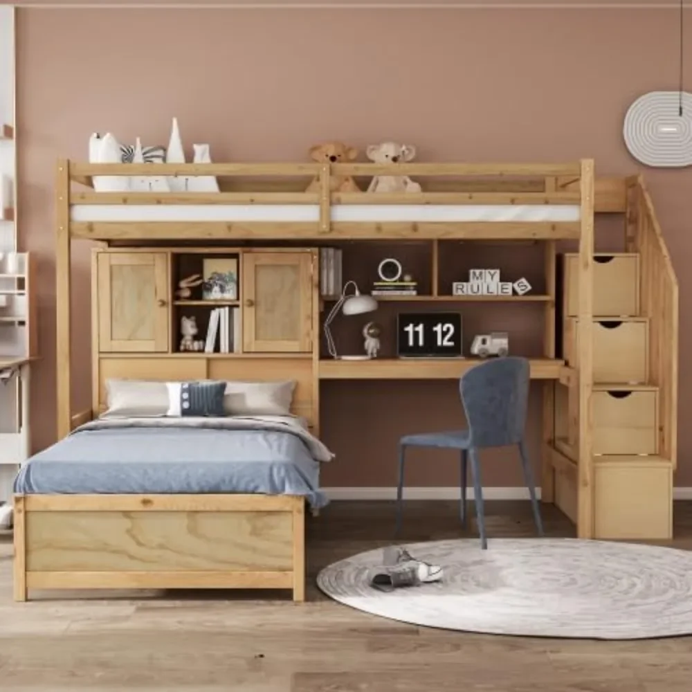트윈 로프트 침대. 계단과 책상이 있는 트윈 오버 트윈 이층 침대, 수납 계단 선반과 서랍이 있는 단단한 나무 로프트 이층 침대,