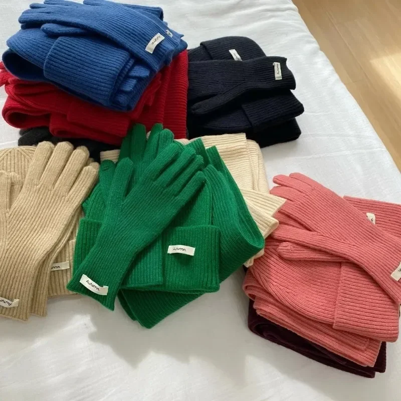 가을 겨울 블루 레드 러블리 3종 여성용 장갑 세트 니트 모자 스카프 솔리드 따뜻한 2025 패션 그린 모자 & 장갑 세트 여성용