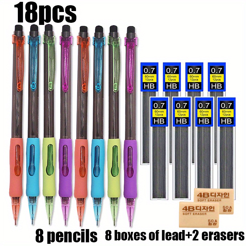 TEMU 18pcs/set 0.5/0.7/0.9mm 교체 가능한 납 코어 사이드 프레스 기계식 자동 펜, 글쓰기, 그림 그리기, 사무용품, 미세한 글쓰기 도구 (8 펜 + 8 납 상자 + 2 지우개), 다용도 기계식 펜 세트 | 기계식 펜 | 내구성이 뛰어난 기계식 펜, 펜질자