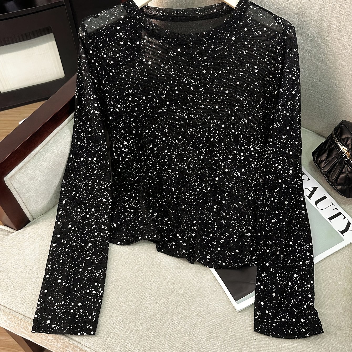 TEMU 세련된 여성용 블랙 앤 실버 포일 라운드넥 긴팔 탑 | 발렌타인데이, 새해 파티 및 기타 행사에 적합