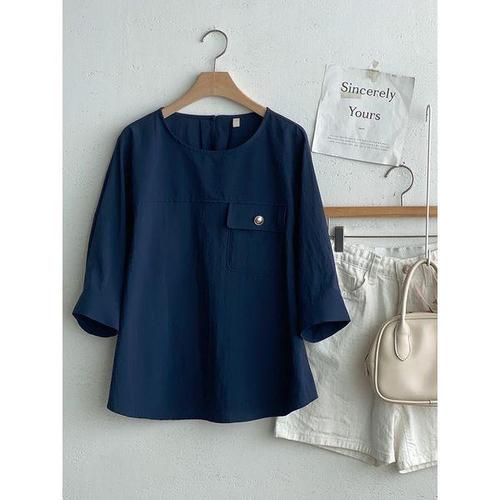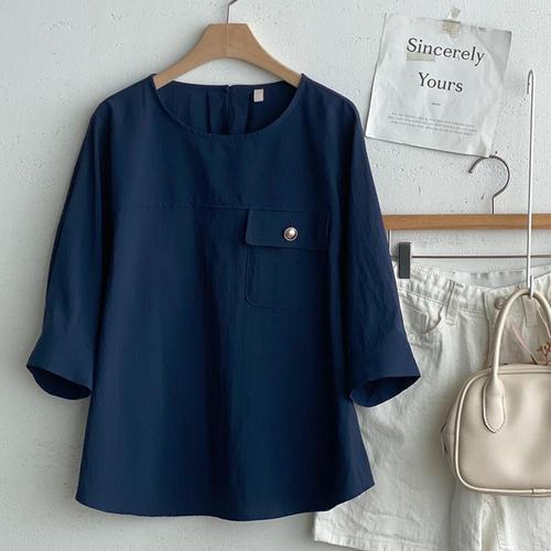 국산 여성 라운드 심플 루즈핏 5부 여름 블라우스 REI-WBL-4642-네이비