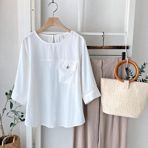 국산 여성 라운드 심플 루즈핏 5부 여름 블라우스 REI-WBL-4642-아이보리