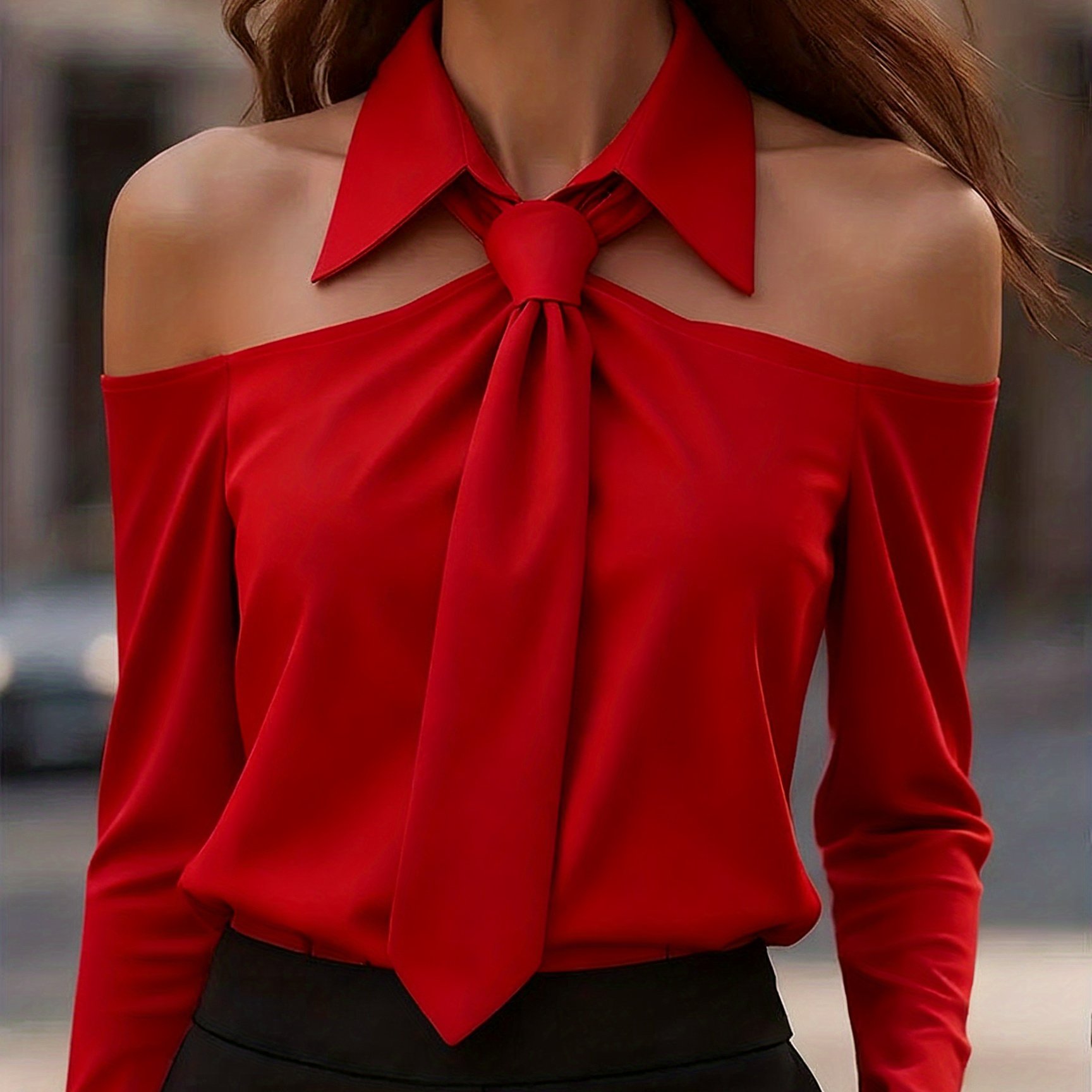 TEMU 우아한 오프숄더 셔츠 | 타이 넥 디테일이 있는 스트랩리스 디자인, 구조적인 칼라, 긴소매, 올 시즌 전문가복