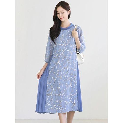 [드리다]여성 봄 여름 리본 패턴 빅사이즈 플리츠 7부 쉬폰 원피스 40-50대 미시 중년여성 엄마옷 하객