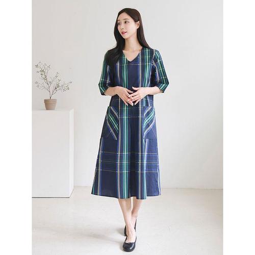 [드리다]여름 브이넥 체크 빅사이즈 면 맥시 롱 원피스 40-50대 미시 엄마옷 하객 모임 캐주얼 중년여성