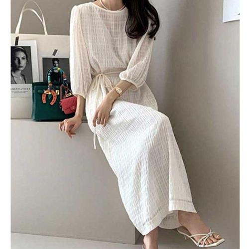[신상오픈런]여성 시스루 롱 원피스 7부 소매 허리끈 패턴 드레스