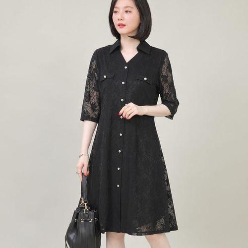 [애비뉴투지]엄마옷 웨딩 레이스 소매 시스루 A라인 카라 오픈 여성 여름 칠부 빅사이즈 원피스 K07323