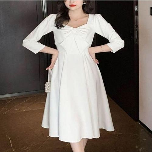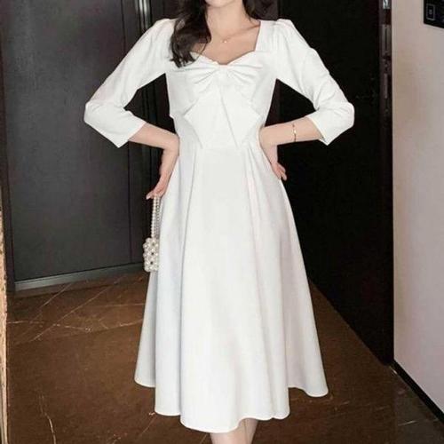 [에이치플러스몰]장식 베이직 리본 7부 소매 올데이 화이트 원피스 A라