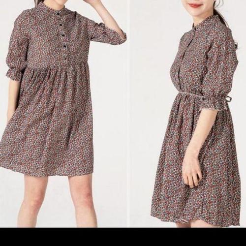 [비꼴리끄]린넨 프린트 라운드 카라 칠부 원피스 B242WO3230