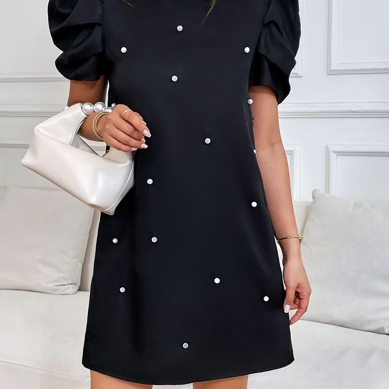 TEMU 2025 유럽&미국 스타일 진주 장식 대조 칼라 퍼프 소매 드레스, 여성 빈티지 스타일 A라인 미니 드레스, 파티&출근룩 눈길 잡는 아이템