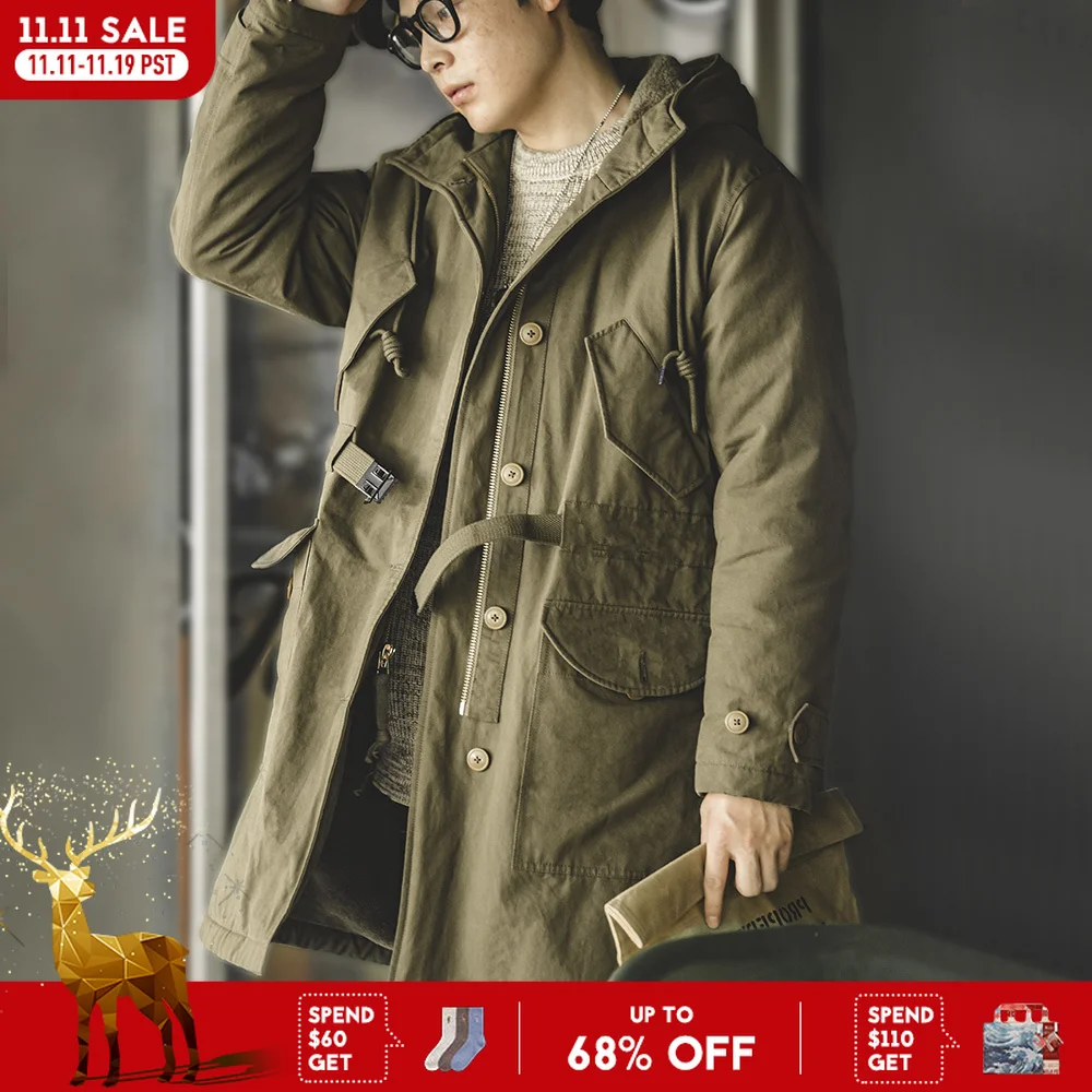 Maden 남성 중량감 있는 M47 파카 중장형 두툼한 후드 코트 조절 가능한 커프스 다수 포켓 디자인 겨울 보온 털 안감 면 패딩 코트