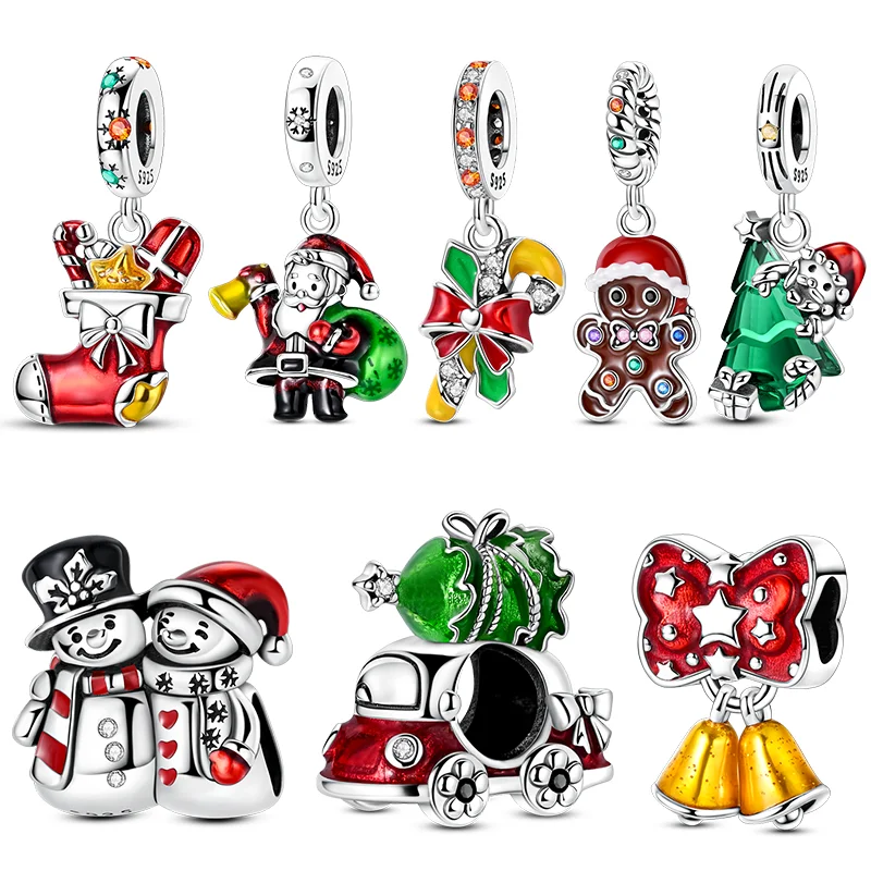 925 스털링 실버 크리스마스 트리 산타 클로스 눈사람 매력 펜던트 여성을위한 원래 팔찌 DIY 크리스마스 선물