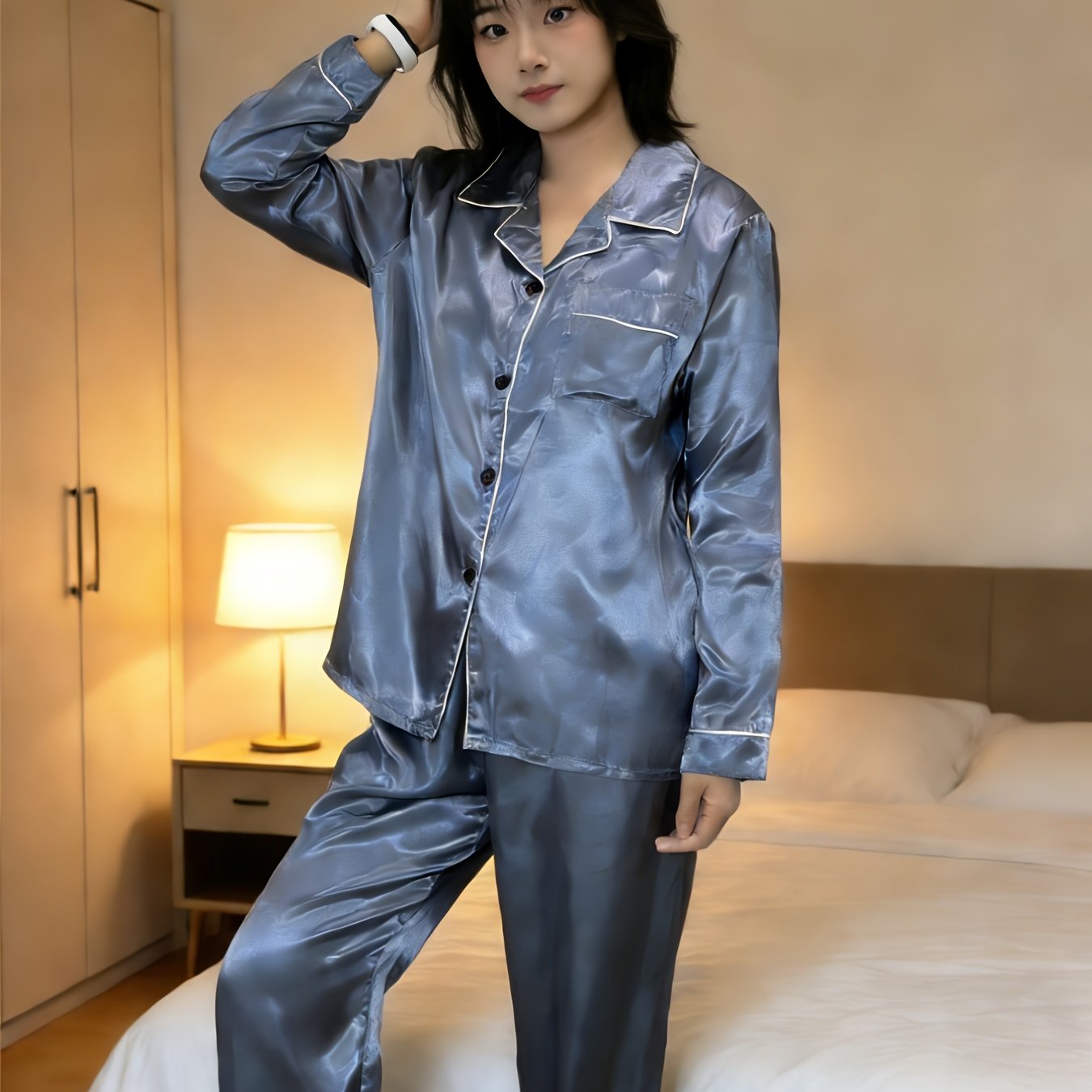 TEMU 여성용 심플하고 캐주얼한 긴팔 상의와 바지 파자마, 라펠 가디건 포함, 봄, 여름, 가을 착용에 적합