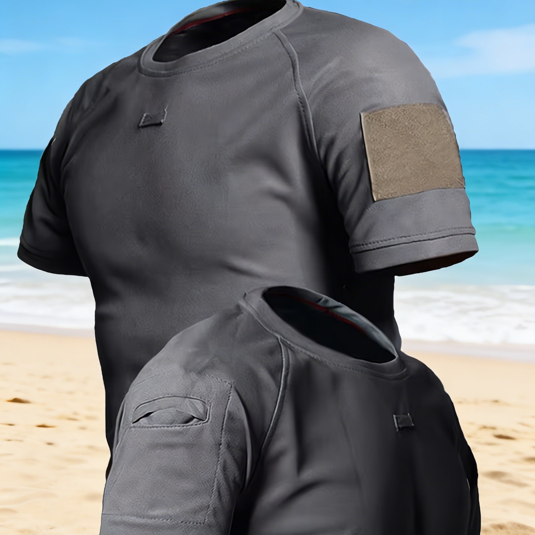 TEMU 남성 여름 야외 하이킹 및 등반용 속건성 반팔 티셔츠. 넉넉한 핑크 포켓, 통기성 좋은 라운드넥, 신축성 있는 반팔이 특징입니다. 이 다용도 단색 상의는 일상복으로 적합합니다.