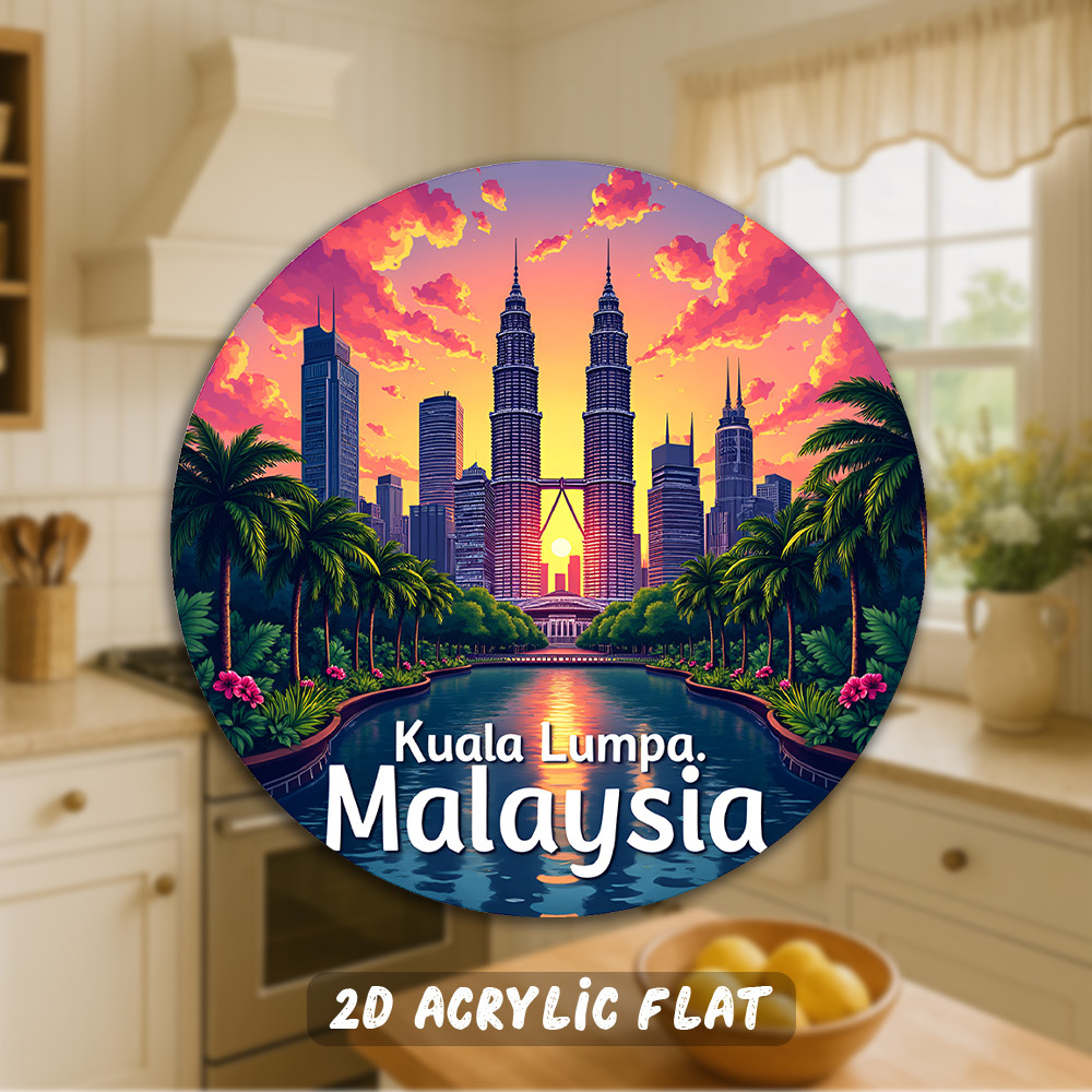 TEMU 2D 플랫 - 쿠알라룸푸르 말레이시아 자석, 페트로나스 쌍둥이 타워의 선셋 디자인, 냉장고, 사무실 또는 여행 장식에 적합. 이 아크릴 자석은 말레이시아의 명소를 위한 기념품으로 사용됩니다.