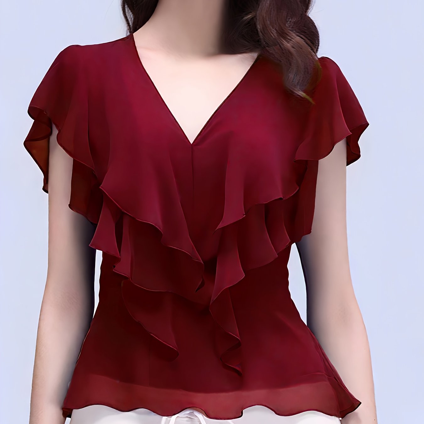 TEMU 슬림핏, 보라색 V넥, 러플 디자인의 반팔 쉬폰 탑