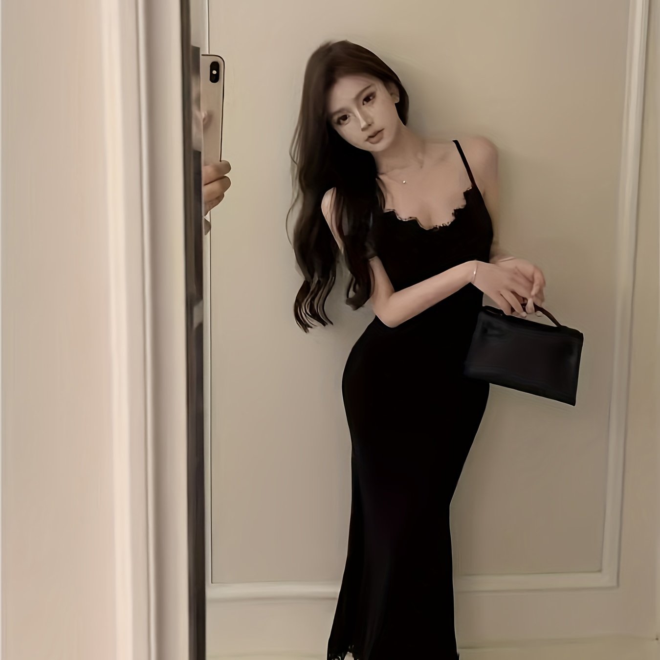 TEMU 여성용 프렌치 스타일 우아한 블랙 레이스 서스펜더 드레스 - 힙 허깅 롱 스커트, 세탁기 사용 가능한 정장 웨딩 파티 드레스, 사계절 착용