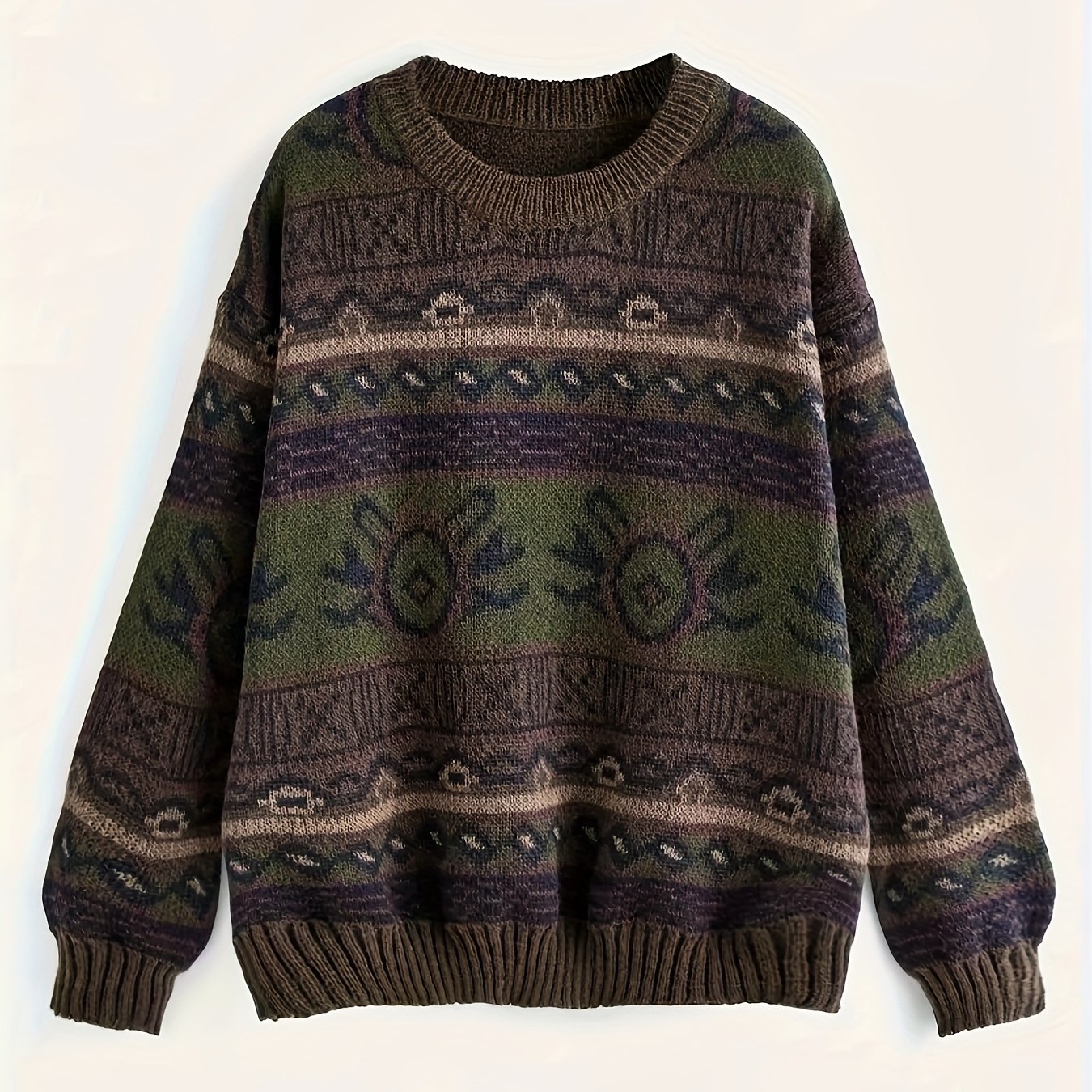 TEMU 여성용 레트로 기하학 컬러블록 스웨터 - 라운드넥, 루즈핏 & 우산형 밑단, 가을/겨울 캐주얼 웨어 소프트 긴팔 풀오버, 어스톤