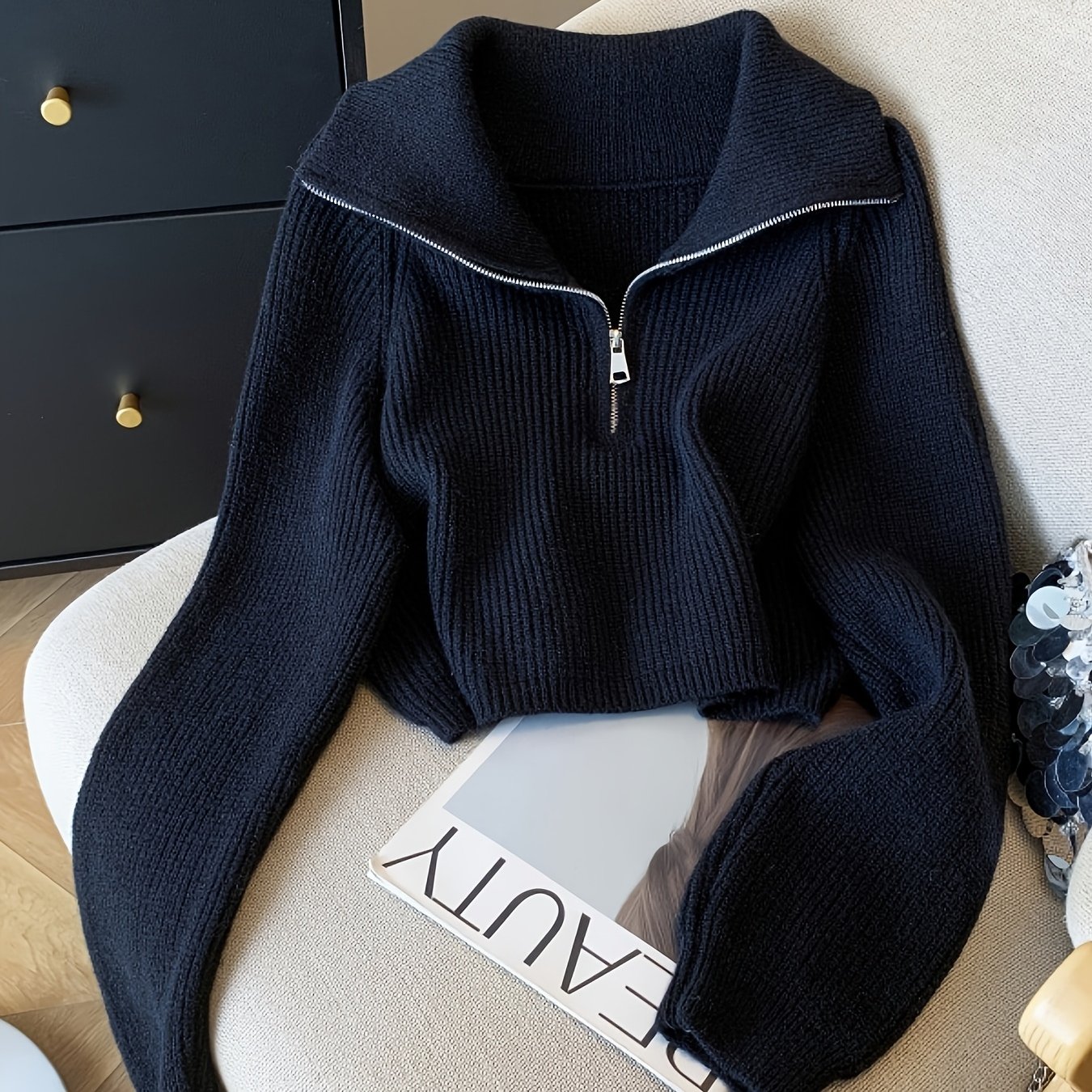 TEMU 여성용 네이비 블루 하프-지퍼 스웨터 - 지퍼 프론트, 루즈핏 레이어링 탑, 가을/겨울용 오피스 & 파티웨어, 매일 입기 좋은 시크한 레이어링 아이템, 클래식 칼라 디자인, 편안한 소재, 스타일리시 블라우스, 패션 애호가를 위한 코지웨어