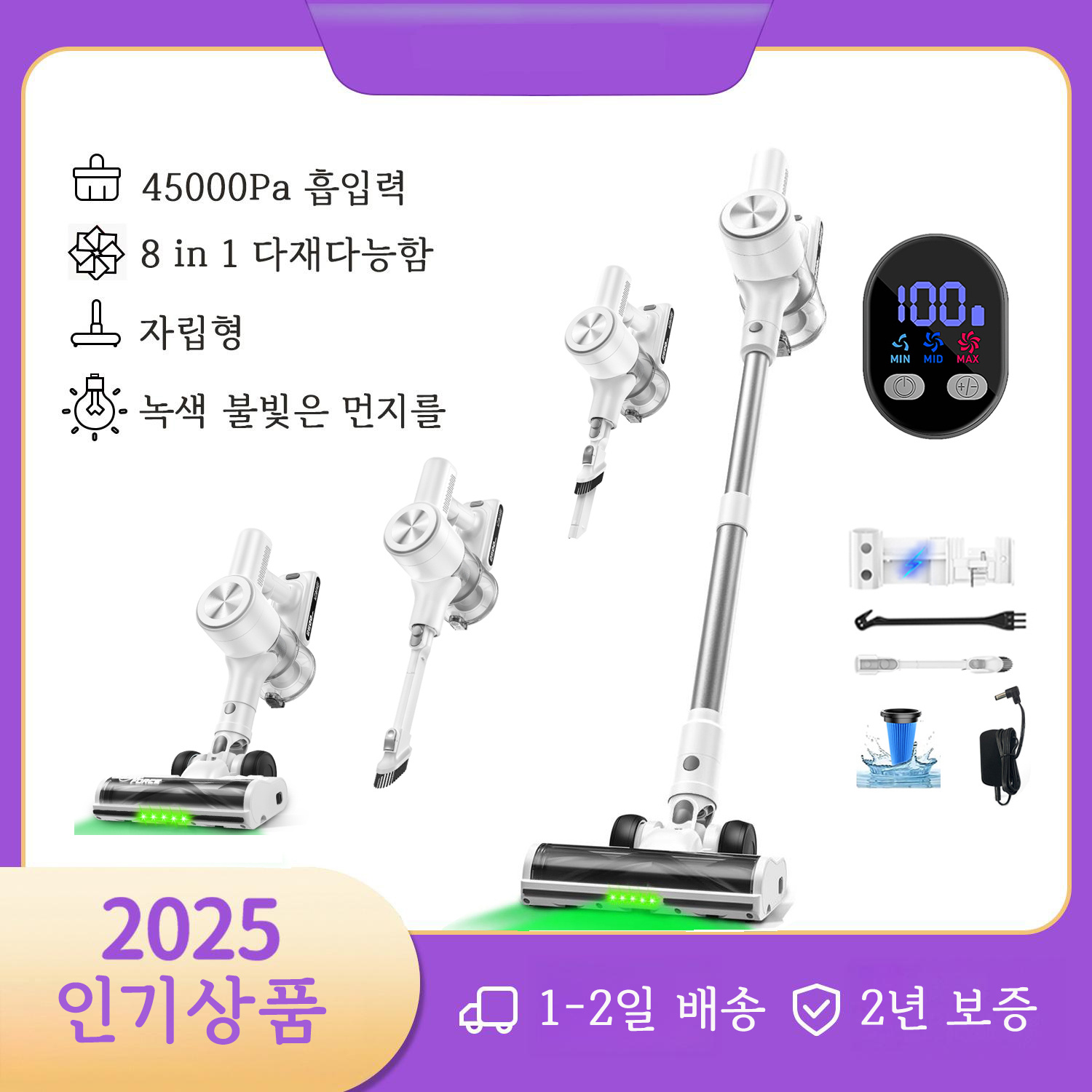 TEMU 자립형 무선 진공 청소기, 가정용 LED 스크린 스틱 진공 청소기, 60분 작동 시간,45Kpa 강력한 흡입력, 업그레이드된 엉킴 방지 녹색 바닥 브러시, 카펫, 반려동물 털, 나무 바닥용 충전식 진공 청소기