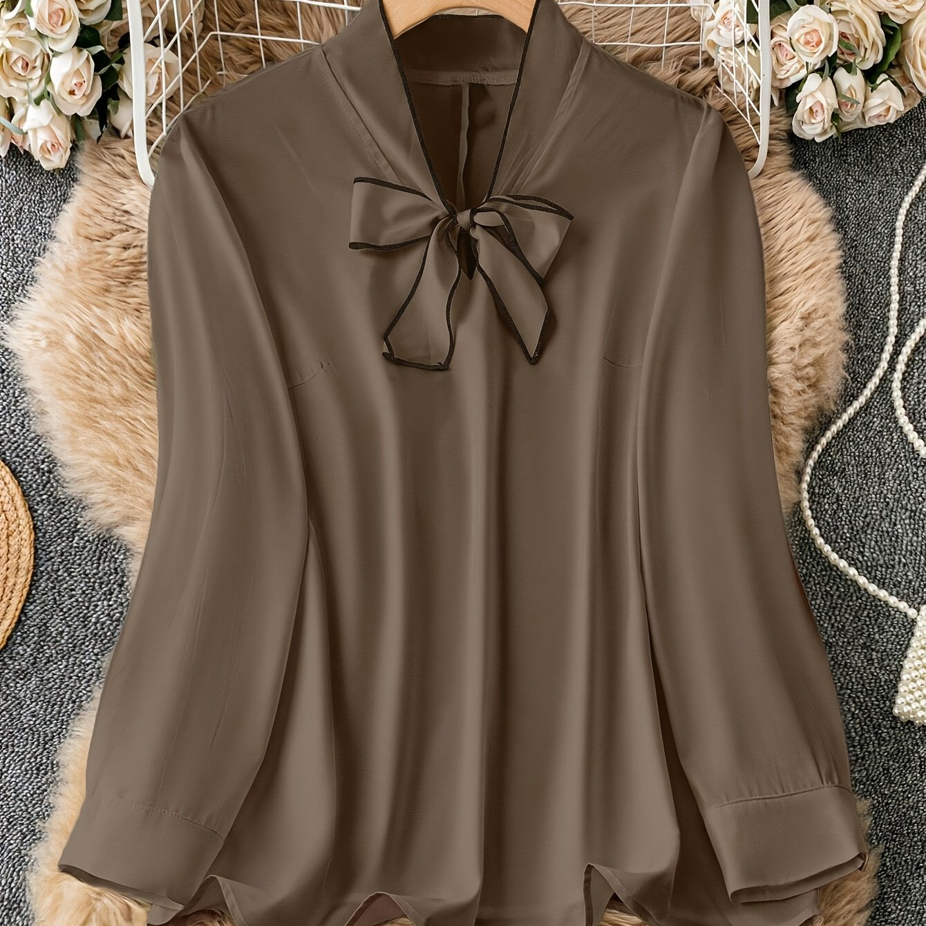 DUOPERI 여성 패션 새틴 브라운 블라우스 옷깃 넥 긴 소매 빈티지 여성 세련된 레이디 셔츠