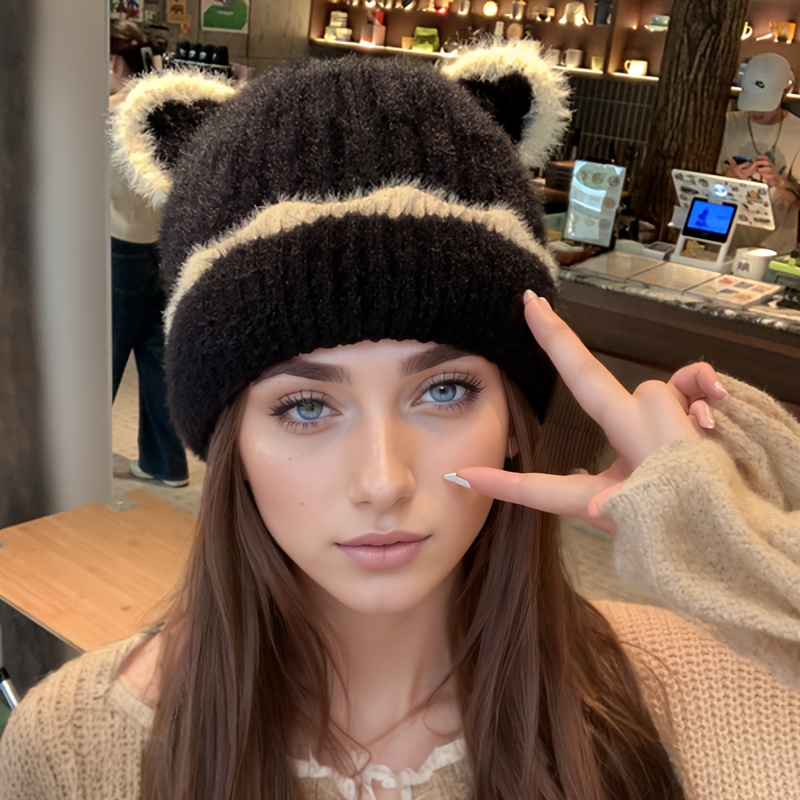 TEMU 1개 여성용 겨울 비니 모자 - 고양이 귀 디자인, 신축성 있는 스컬 캡, 가볍고 따뜻한 스키 및 야외 활동용, 세탁 가능, 귀여운 일본 스타일, 추위 날씨에 적합, 부드러운 소재, 내구성 강한 헤드웨어, 패션 애호가를 위한 겨울 액세서리