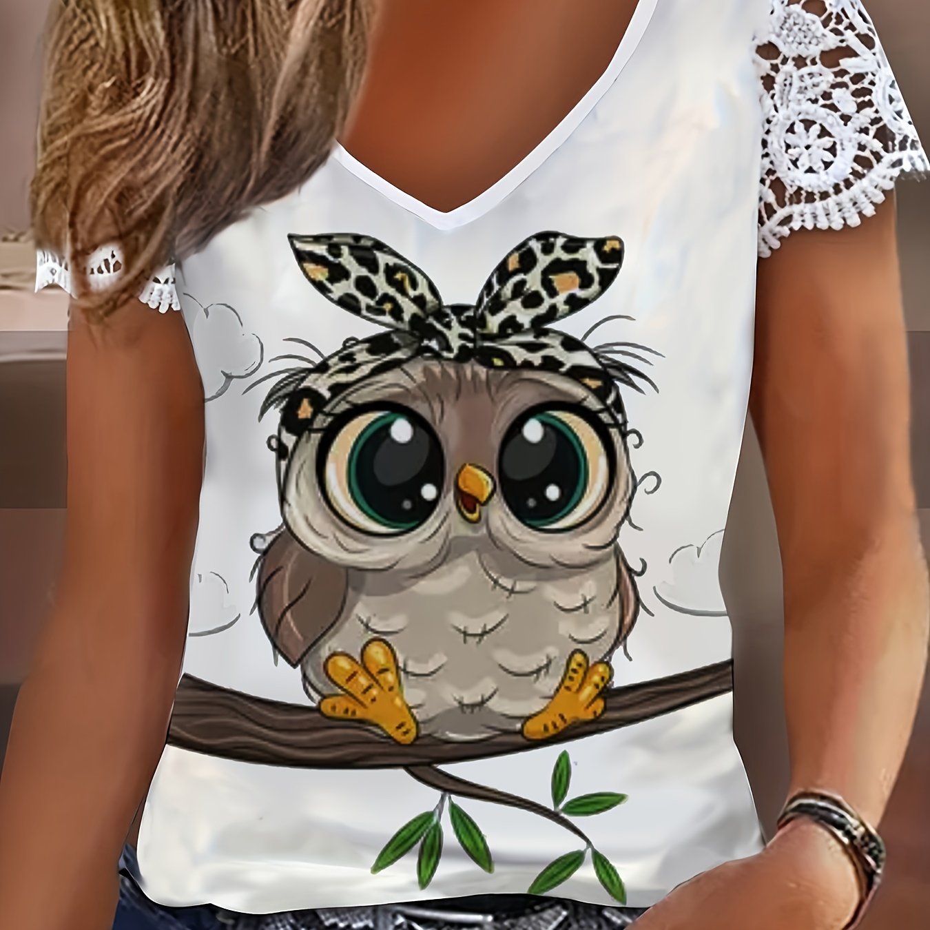 TEMU 새로운 봄/가을 올빼미 프린트 레이스 트림 V넥 티셔츠