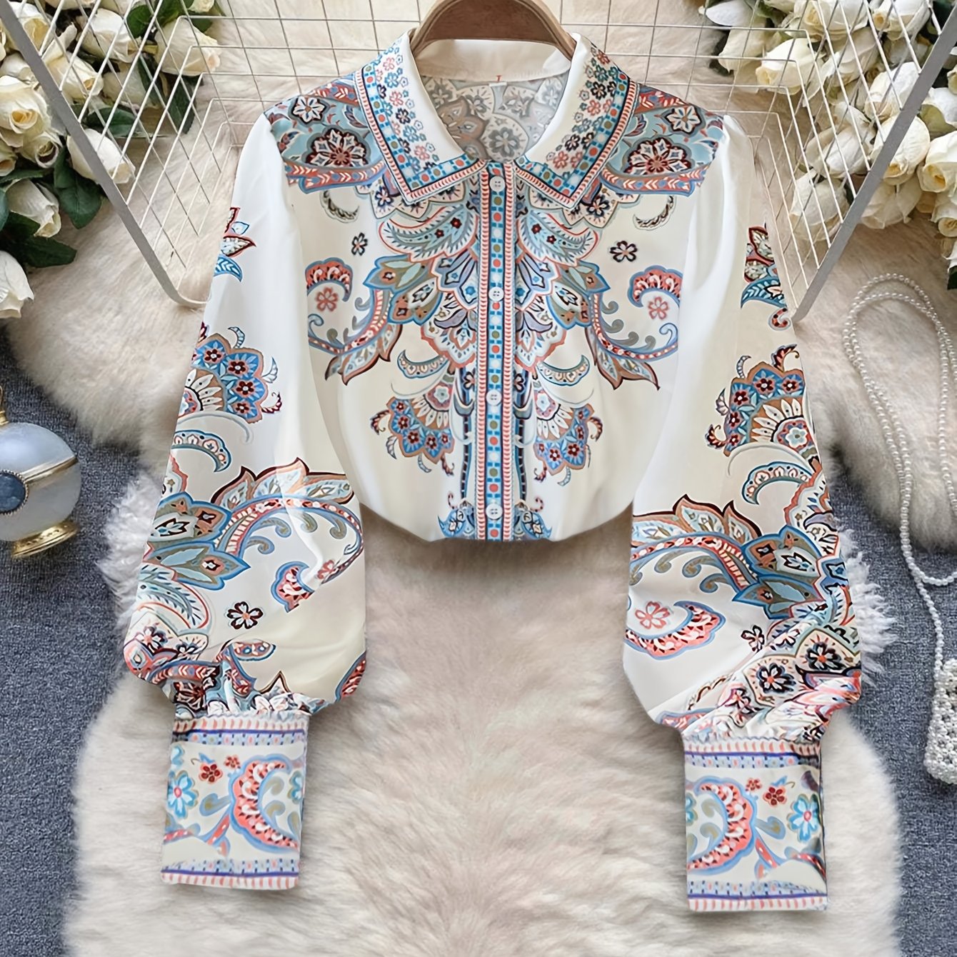 TEMU 예쁜 여성용 셔츠, 프렌치 스타일 우아한 랜턴 슬리브 디자인, 프린트 원단 긴팔 셔츠, 데이트 나이트 YD88