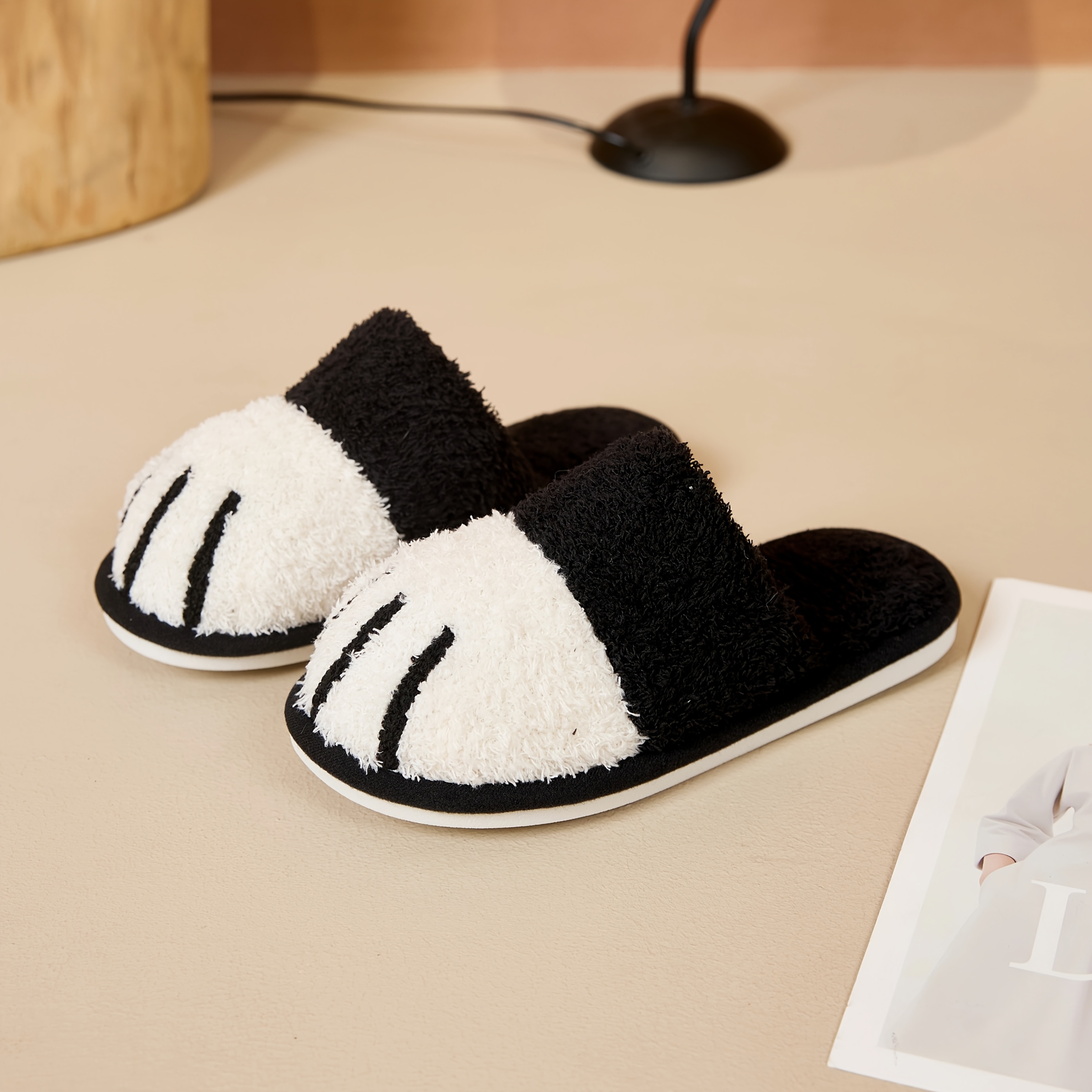 TEMU 후이 부인의 플러시 고양이 발바닥 슬리퍼 - 겨울용 따뜻한 슬립온 파자마 스타일 하우스슈즈, 발바닥 프린트 & 화이트 포우, 편안한 TPR 밑창 & 부드러운 귀여운 고양이 귀 디자인 (조립 불필요) 실내/외 사용 가능 - 선물로 추천