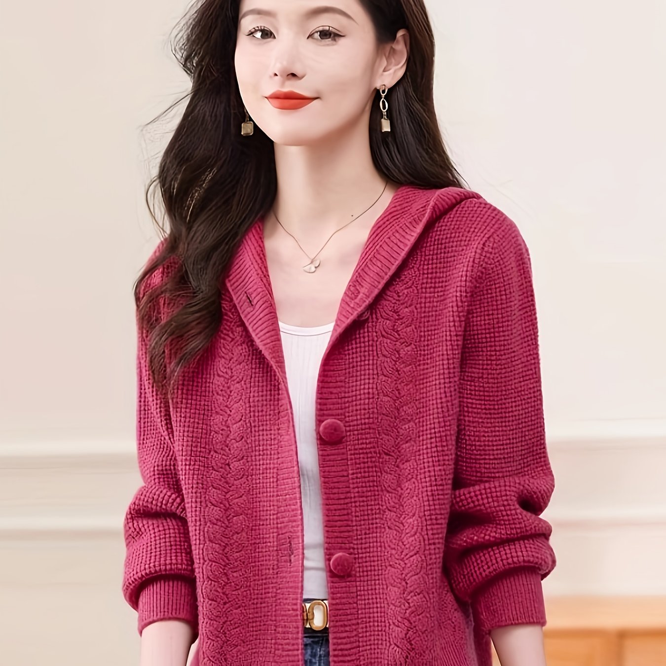 TEMU 여성용 케이블 카디건 긴팔 후드 버튼 프론트 스웨터 - 중간 스트레치 단색 가을 겨울 캐주얼 시크 아우터웨어, 후드 넥라인, 편안한 핏|가디건
