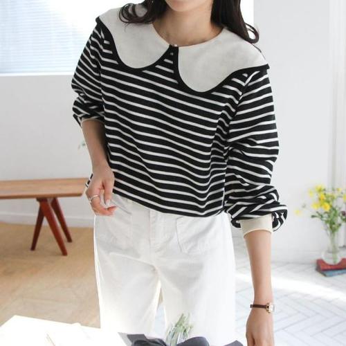 여성 스트라이프 카라 긴팔 퍼프 티셔츠 네이비(SW0DKS10449)