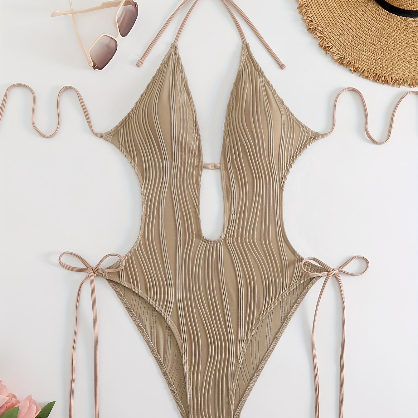 TEMU 여성용 시크한 백리스 홀터 원피스 수영복 - 섹시하고 신축성 높음, 단색 타이 디테일, 세탁기 사용 가능