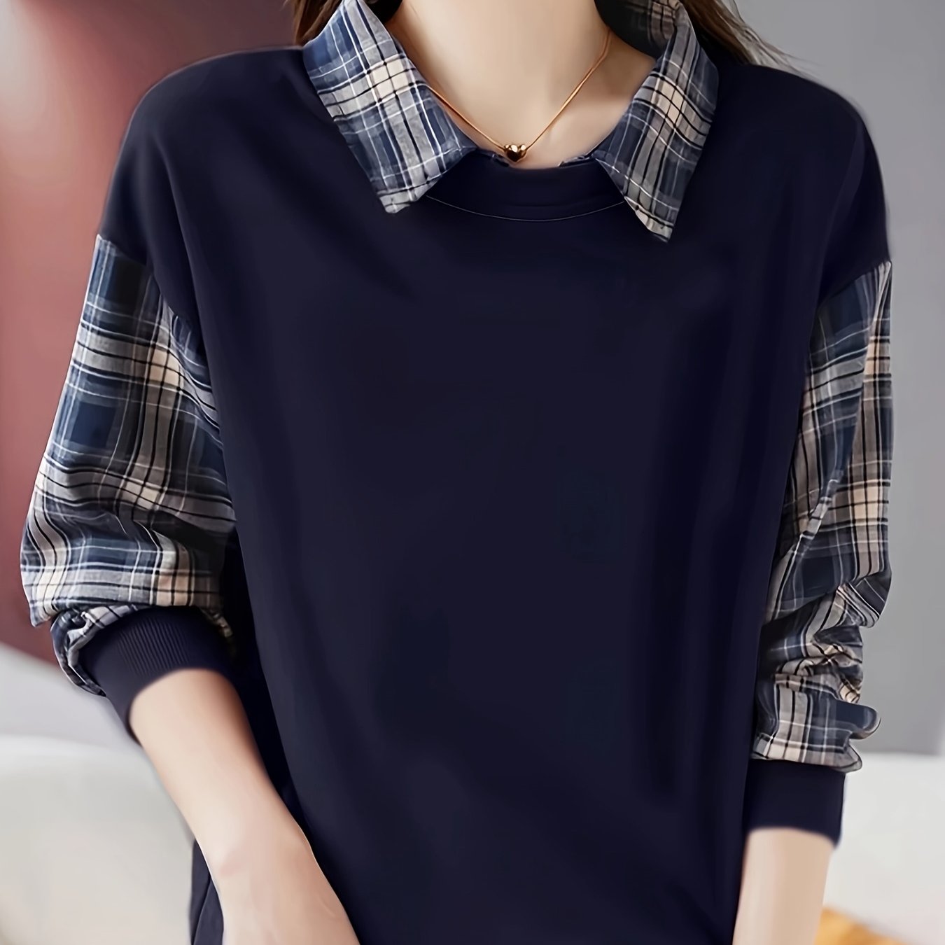 TEMU 유럽과 미국 트렌디한 여성을 위한 고품질 체크무늬와 컬러블록으로 장식된 긴팔셔츠, 우아하고 핏감 있는 가을·겨울용 패션탑