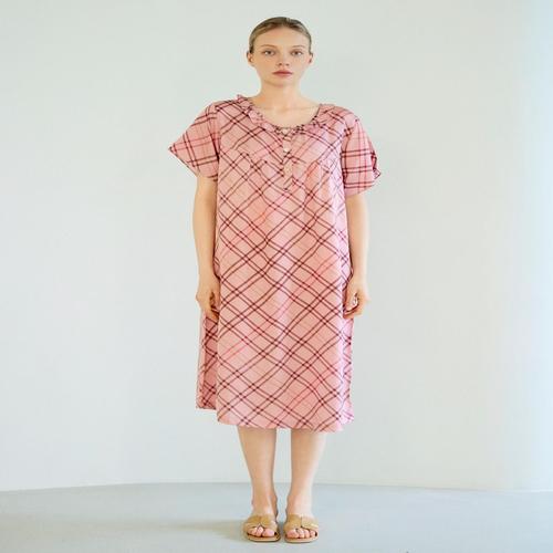 닥스 여성 핑크 체크 셔링 장식 풍기 인견 반소매 원피스 파자마 (DLUN5B292P2)