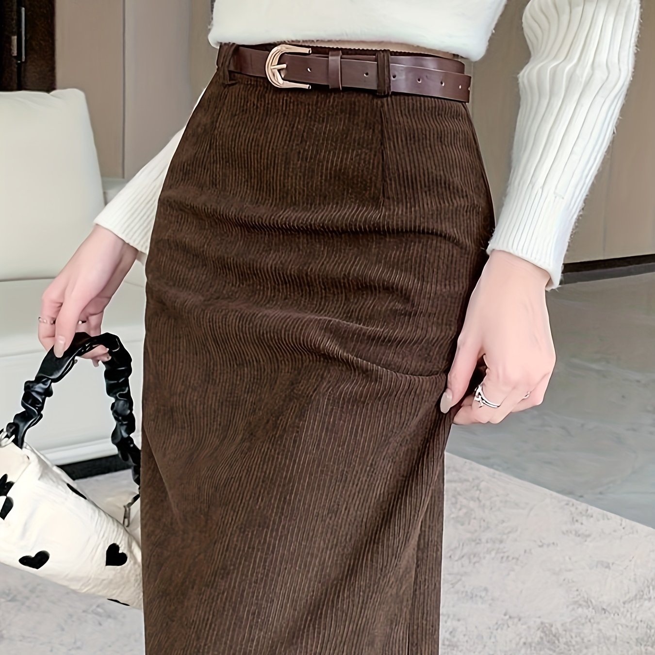 TEMU 여성용 하이웨이스트 코듀로이 스커트 - 포켓 디자인, 우아한 브라운, 편안하고 스타일리시, 캐주얼 또는 포멀웨어에 적합, 캐주얼 아웃핏 | 우아한 스커트 | 코듀로이 소재
