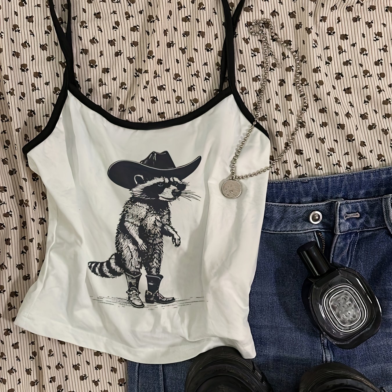 TEMU 여성용 캐주얼 섹시 바디콘 크리스크로스 홀터넥 탱크탑, 블랙 앤 화이트 컬러 블록, 너구리 프린트, 카우걸 스타일, 여름용