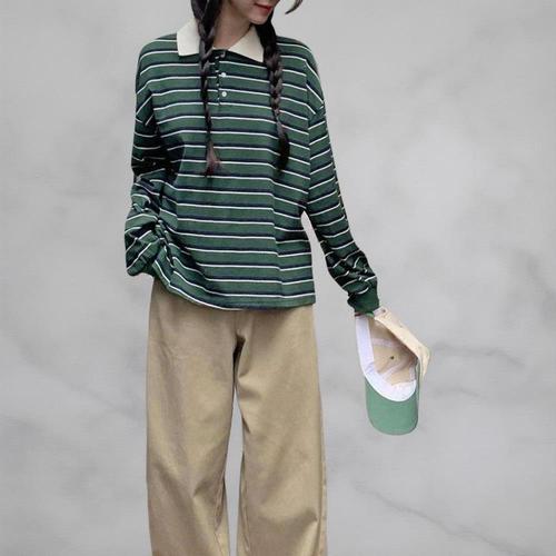 [옷자락]여성 배색 스트라이프 A라인 루즈핏 카라넥 긴팔티셔츠