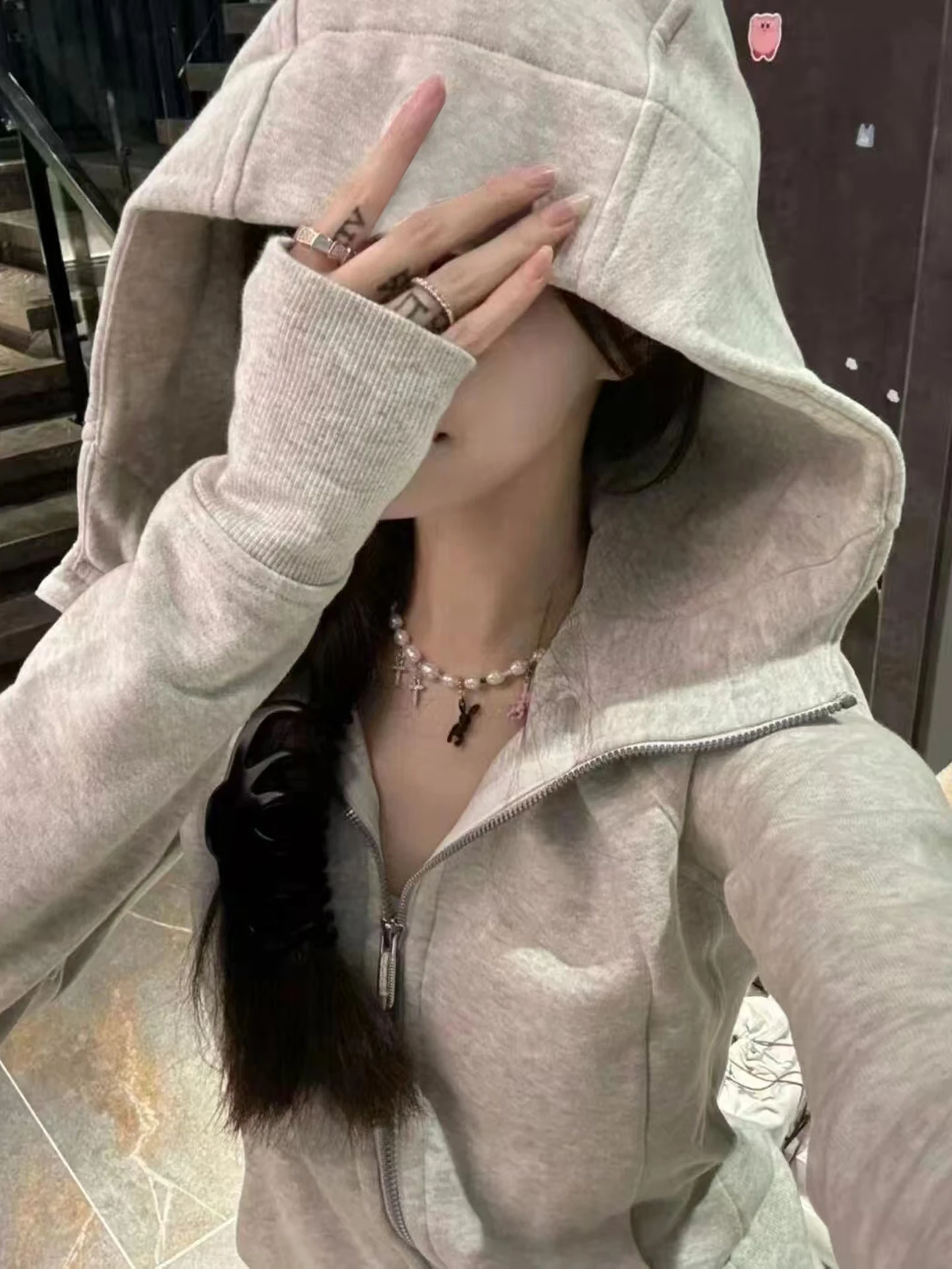 레트로 아메리칸 화이트 그레이 슬림핏 후드 재킷 여성용 얇은 가을 지퍼 허리 조절 가능 풀오버 방수 숏 코트