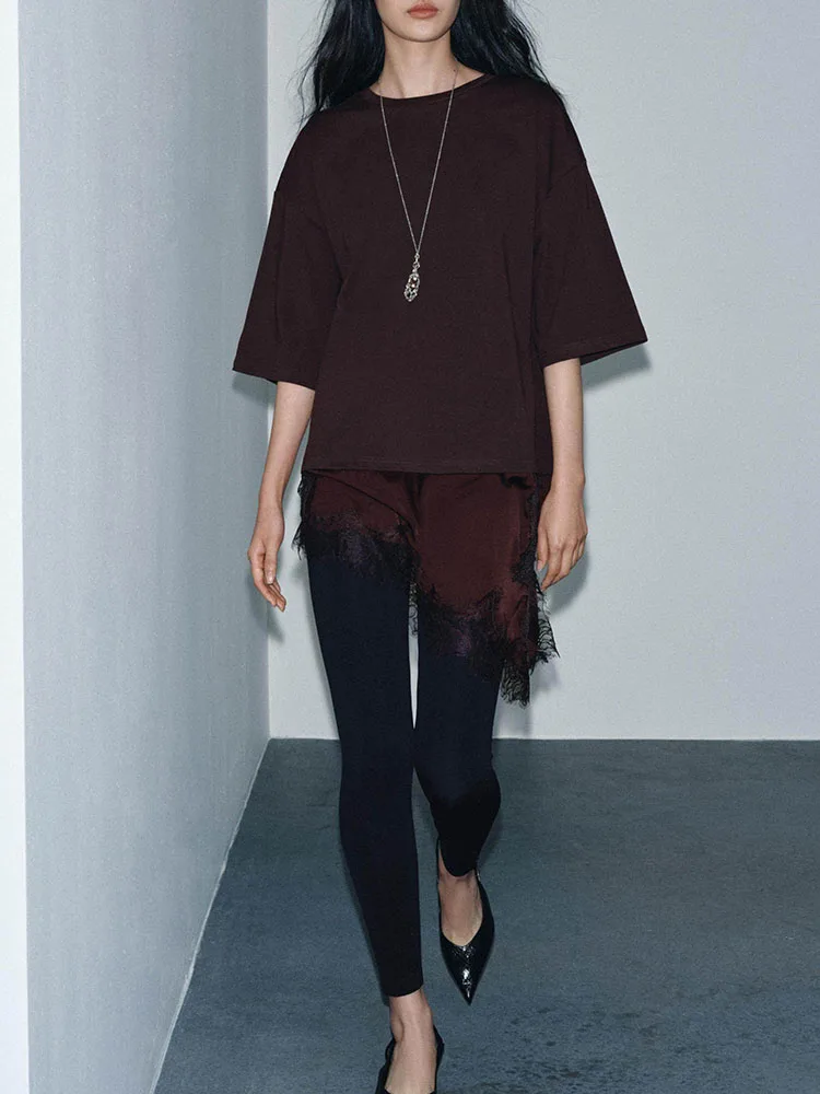 TEMU 여성용 대비 레이스 트림 라운드넥 티셔츠 - 고탄력 캐주얼 탑, 통기성 봄/여름 솔리드 컬러 디자인, 손세탁 전용