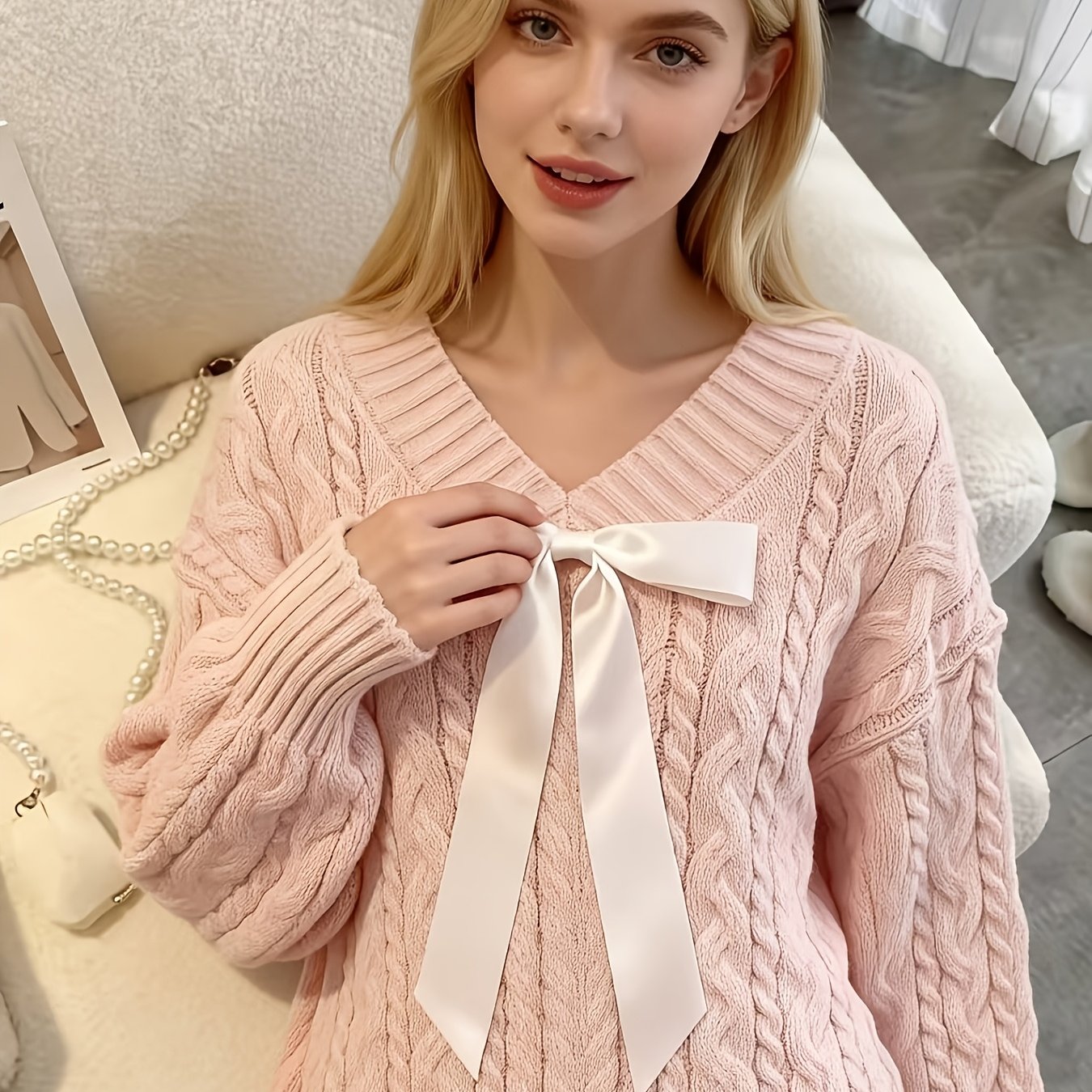 TEMU 플러스 사이즈 - 플러스 사이즈 보우 장식 V넥 풀오버 | 부드러운 왁스감의 루즈한 게으른 스타일, 랜턴 소매, 가을/겨울용 중간 신축성 원단