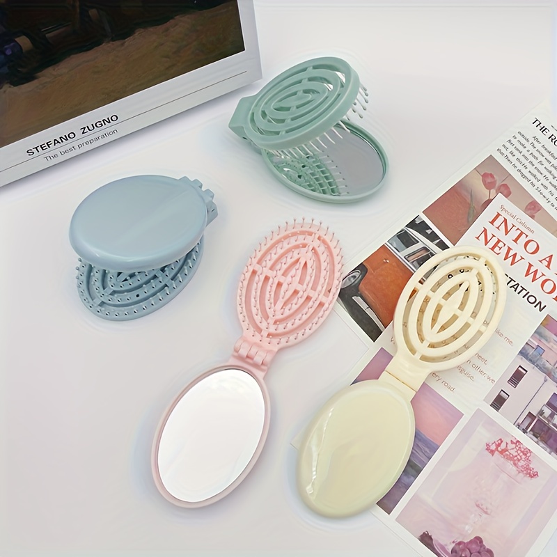 TEMU 여성용 휴대용 접이식 빗 + 에어 쿠션 헤어 마사지기 & 거울 - 미니 여행용 헤어 브러시, 일반 모발에 적합, 나일론 마사지 빗 - 스타일링 & 두피 케어, 여성을 위한 컴팩트 헤어 케어 필수품