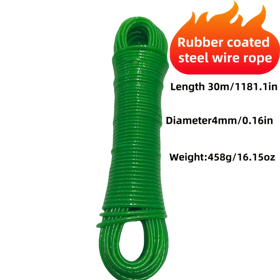 TEMU 30미터 녹색 스틸 와이어 빨래 건조대, 코팅 와이어, 방수 및 녹 방지, 튼튼하고 내구성 좋음, 가정/발코니/야외/여행용, 와이어 로프, 빨래 건조대, 빨래 건조대