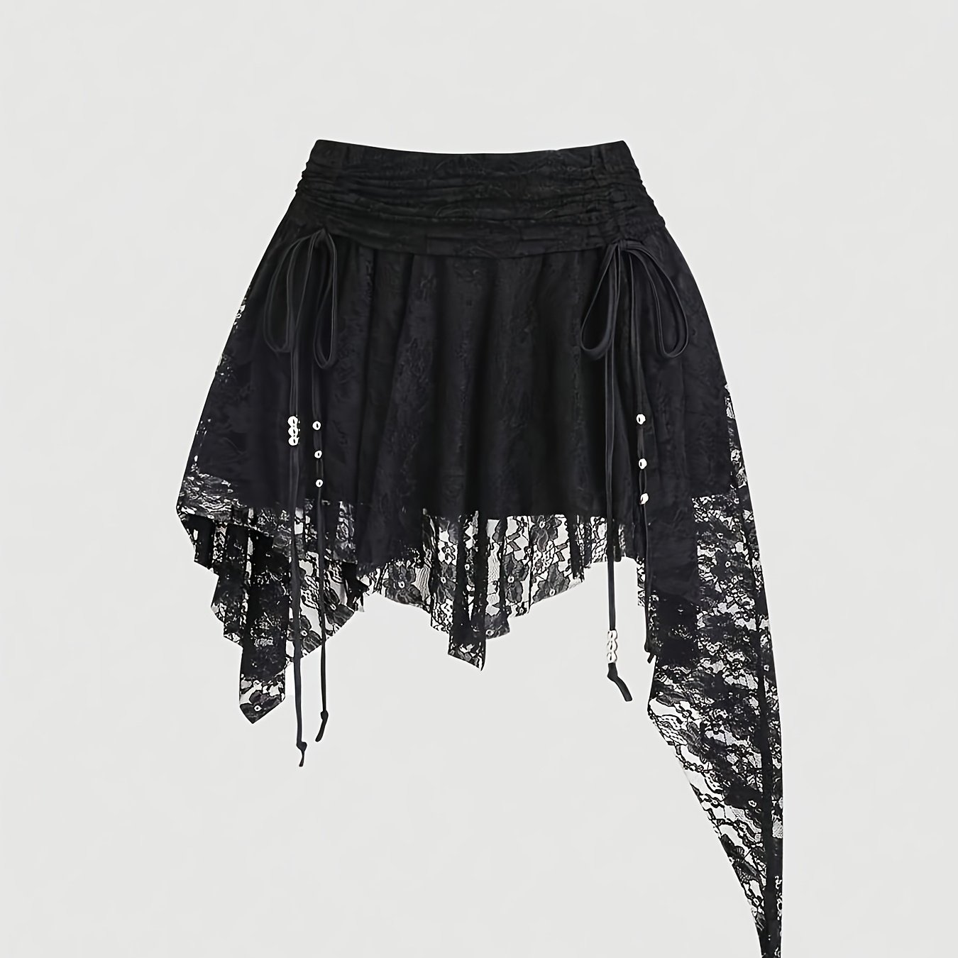 TEMU 스타일 레이스 러플 비대칭 밑단 드로스트링 허리 플리츠 여성 미니 스커트