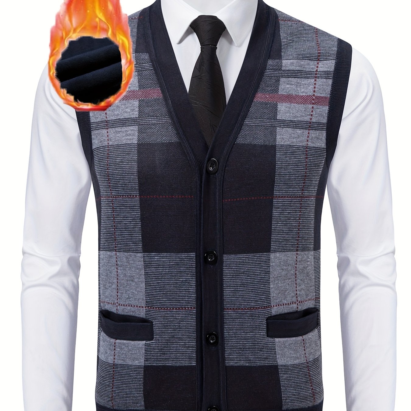 TEMU 남성용 기모 안감 대형 체크 니트 가디건 조끼