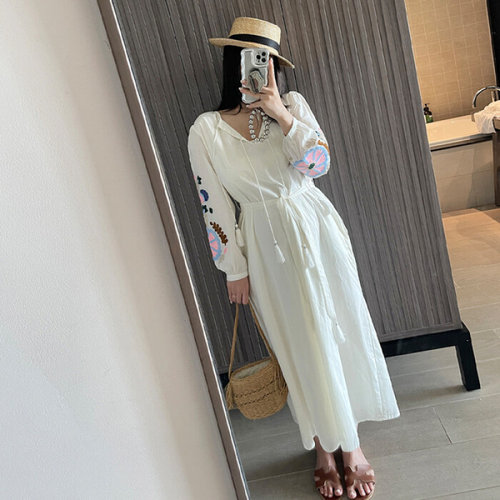 글램핏 / 해외여행 룩 빈티지 자수 루즈핏 태슬 허리 끈 롱 간절기 여름 원피스