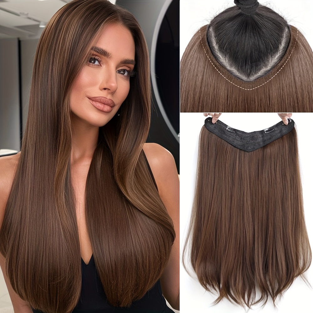 TEMU 24인치 인비저블 헤어 익스텐션 여성용 롱 V형 헤어 익스텐션 3/4 풀 헤드 클립 인 헤어 익스텐션, 볼륨 추가용, 4개의 안전 클립, 합성 천연 소프트 인비저블 브라운 헤어 익스텐션, 데일리 파티용