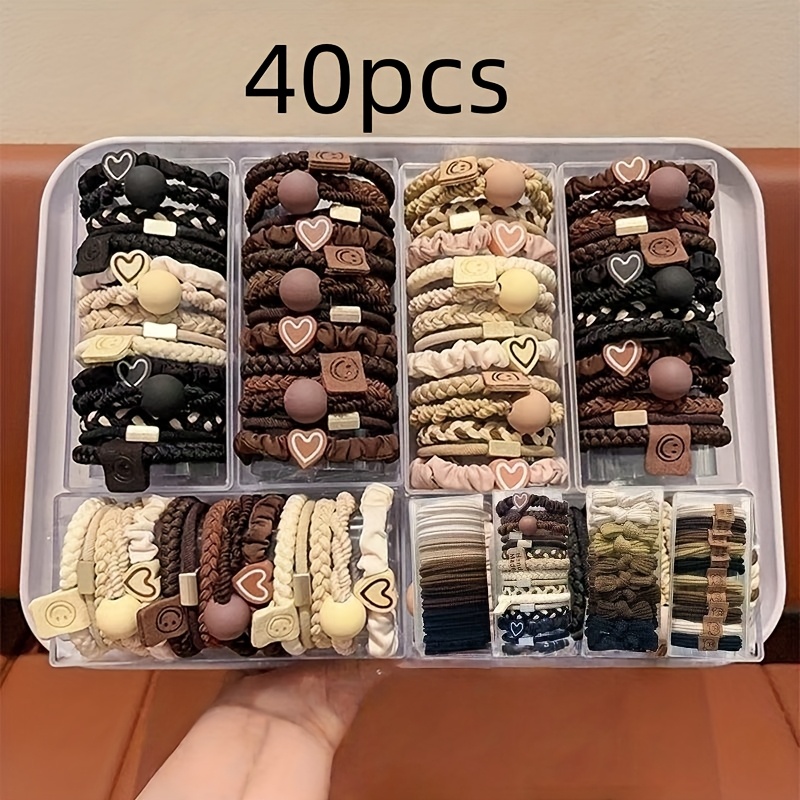 TEMU 40개 중국 스타일 헤어 고무줄 세트 - 하트 & 얼굴 참 장식, 중성 베이지/브라운/블랙/화이트/핑크 투명 헤어 타이, 땋은 머리, 포니테일, 번 헤어 액세서리 - 일상 및 크리스마스 파티용 여성 헤어 액세서리
