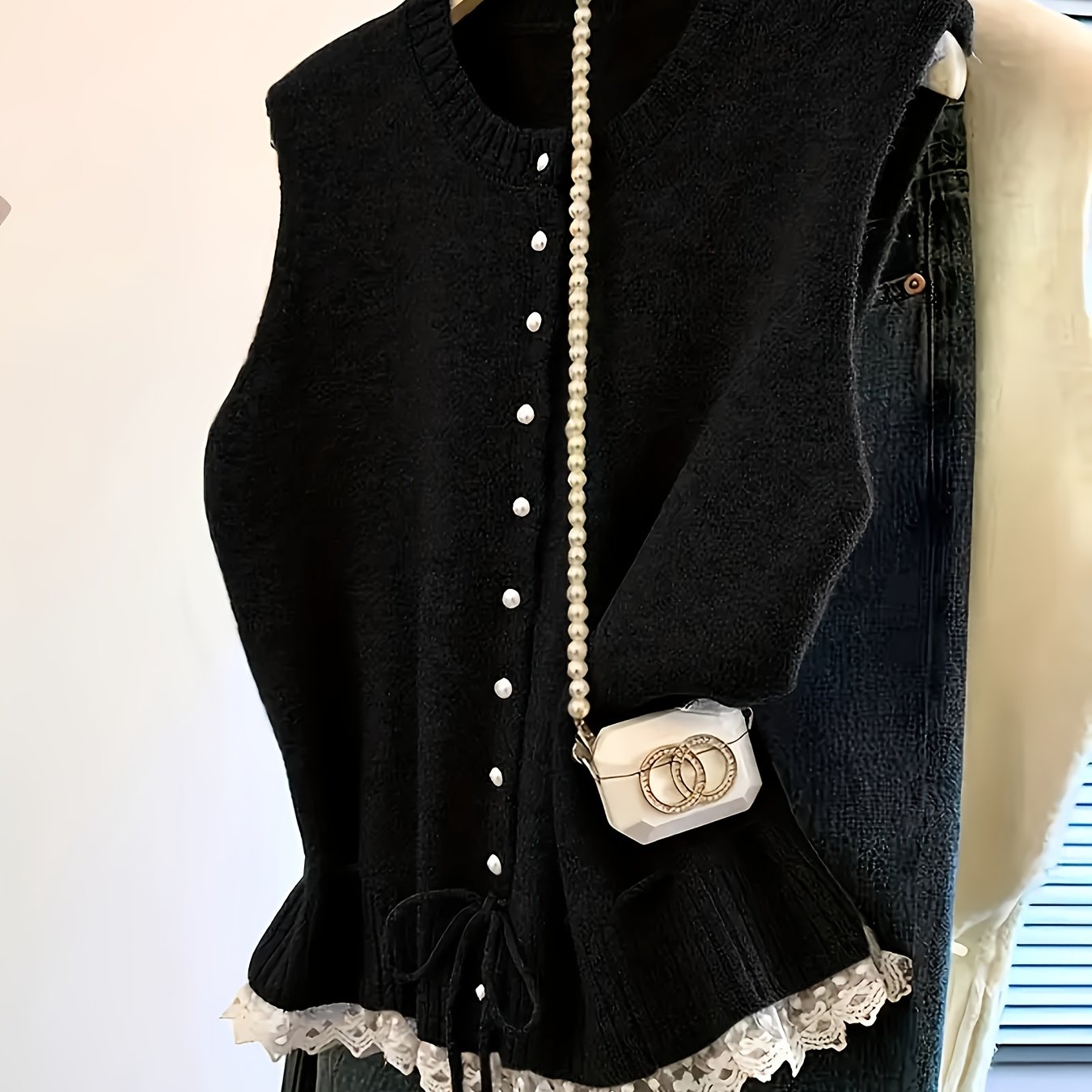 TEMU 여성용 우아한 진주 버튼 프론트 가디건 - 네이비 레이스 트림 스웨터, 러플 헴, 긴소매 레이어링, 가을/겨울, 오피스, 파티, 데일리 시크룩 - 여성 패션 아우터, 여성 가디건, 겨울 레이어링|가디건|패션